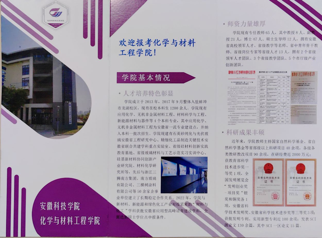 为积极应对新旧高考志愿填报模式转变可能带来的生源质量变化挑战,化学与材料工程学院在高质量完成学校下达的招生宣传任务基础上,学院还制作了“欢迎报考爱游戏官方网站_爱游戏(中国)股份有限公司,化学与材料工程学院”H5易企秀,组织师生利用微信群、QQ群宣传;学院印制了“欢迎报考化学与材料工程学院”纸质宣传册子,随同学校的宣传材料一并发放,主动向有化学及材料类报考意愿的考生及家长介绍学院,吸引考生关注学院。