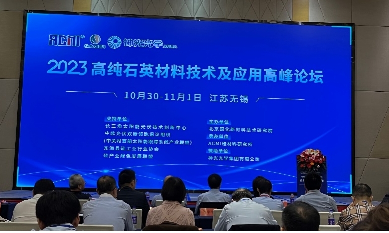 10月30-11月1日,由长三角太阳能光伏技术创新中心、中欧光伏双碳领跑倡议组织、东海县硅工业行业协会、硅产业绿色发展联盟支持,北京国化新材料技术研究院主办,ACMI硅材料研究所承办,神光光学集团有限公司赞助的“2023高纯石英材料技术及应用高峰论坛”在江苏无锡隆重召开。来自全国各地的高纯石英产业链生产企业、科研院所、贸易商及配套企业的150多位专家、代表齐聚一堂交流学习。我校安徽省石英砂纯化和光伏玻璃工程中心教师郑胜彪参加会议。