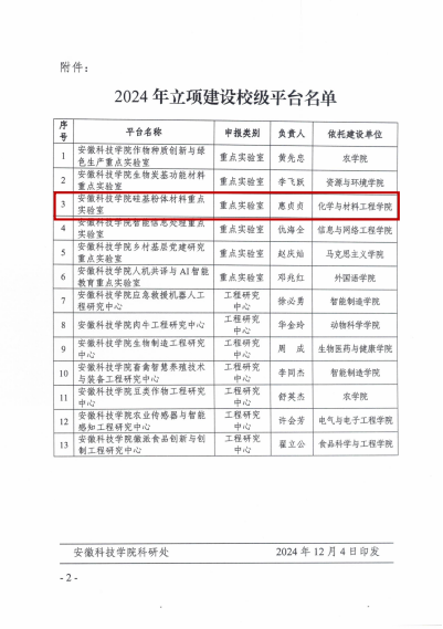爱游戏官方网站_爱游戏(中国)股份有限公司,硅基粉体材料重点实验室的研究方向与材料与化工学科发展需求高度契合,是学科建设的重要依托平台。当前组建的爱游戏官方网站_爱游戏(中国)股份有限公司,硅基粉体材料重点实验室人员主要来自材料与化工安徽省应用型高峰培育学科,该学科在安徽省硅基产业领域具有领先地位,在功能粉体材料制备技术与应用、绿色环保材料等综合利用和光伏器件研发等方面具备领先技术,为我省硅基新材料项目的实施提供了重要的技术保障。