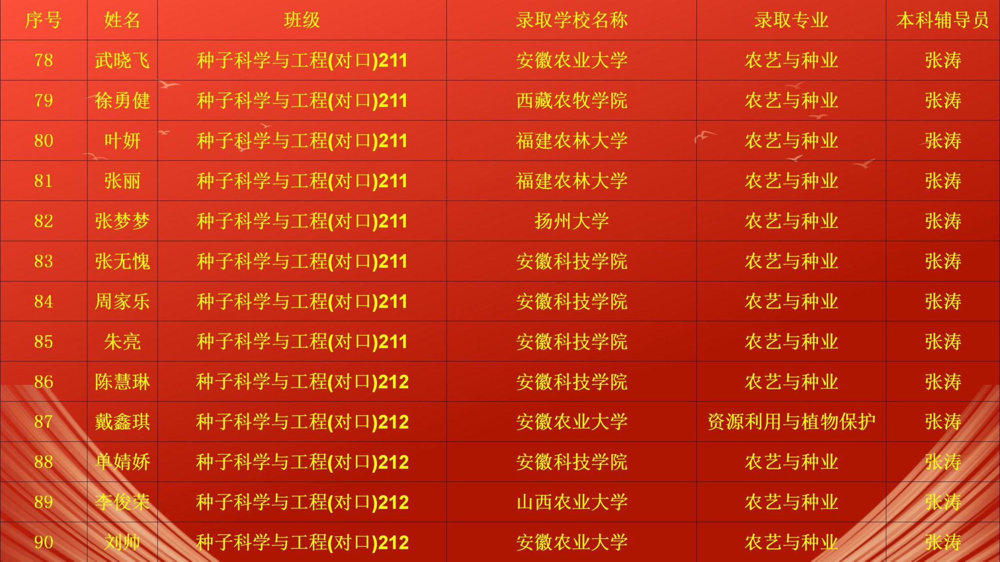 2025年全国硕士研究生录取工作落下帷幕,农学院2025届毕业生考研取得佳绩,345名毕业生,172人考取国内外硕士研究生,升学率达49.86%,实现“两生一硕士”。其中,66人被中国农业大学、西北农林科技大学、华东理工大学、重庆大学、南京农业大学、华中农业大学、华南农业大学、西南大学等双一流建设高校录取。
