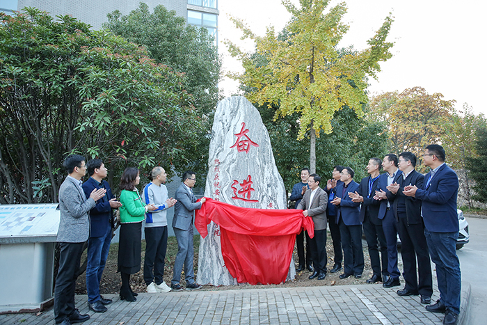 据悉,此校庆石系全体杭州校友出资购买,安放于凤阳校区西校区新知楼A楼东侧草坪处,为学校增添了一处新的景观。该石高3.75米,宽1.90 米,厚0.66米,石头上镌刻有“奋进”主题词,另篆刻:热烈祝贺爱游戏官方网站_爱游戏(中国)股份有限公司,建校七十周年!